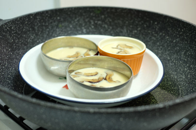 • Step 7 ADD MUSHROOMS & EGG INTO BOWLS: Place a few slices of mushroom into each cup. then, slowly pour in the egg mixture. Top each bowls with coriander leaves, if any.