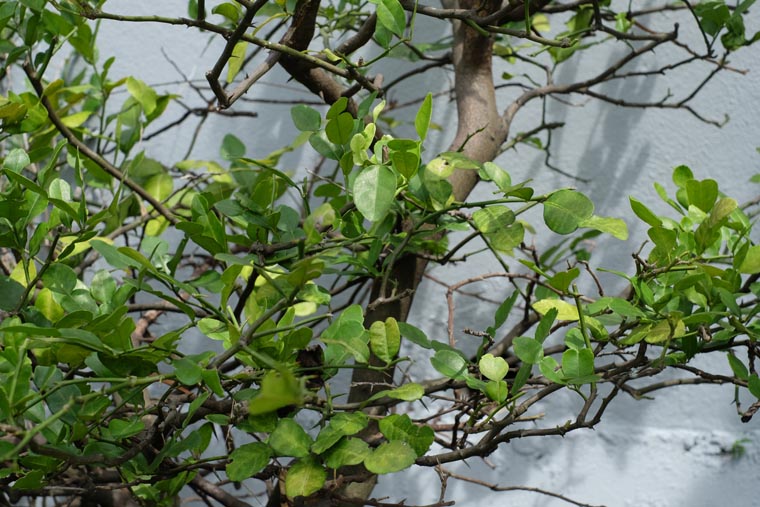 Unlike other trees where the fruit takes the centre-stage, Kaffir lime leaves are more widely used. From what I gather from botanist, there are true kaffir lime leaves which stems has obvious thorns and the hybrid one which doesn’t. The former is much more fragrant, but takes a much longer time to grow. I have tried but failed to buy true kaffir lime tree. Fortunately, I have access to it through my neighbour’s trees.