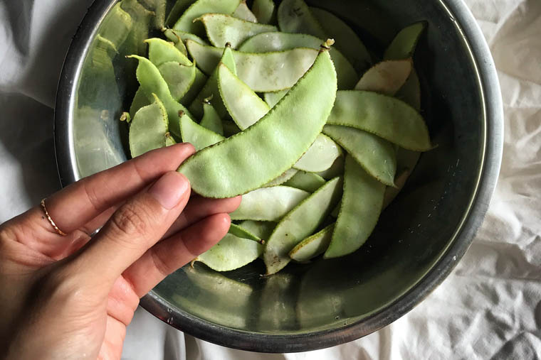 Older beans are more fibrous, so we remove the tips. We then soak it in water before cooking.