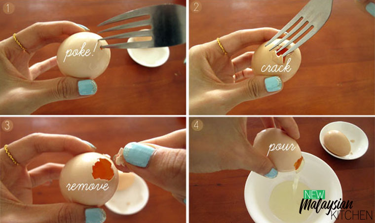 3. REMOVE With your fingers, remove pieces of egg shells to form a hole. An ideal size should be about the size of 5 cents. If its’ too small, it’ll be difficult for the white to flow out of the egg. If it’s too big, the yolk will flow out together.