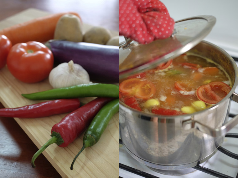 • Step 1 TO COOK DAL: Boil soaked dhal, garlic, red chilies, green chilies, chilli and turmeric powder in a pot for 10 minutes or until lentils soften. Add in potatoes, carrots and tomatoes. On medium fire, cook for 15 minutes or until the vegetables softens. Add in brinjals and cover the pot with a lid.