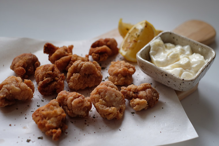 Marinate 500 g chicken thigh cut into bite-size with 1 tbsp grated ginger, 1 clove minced garlic, 2 tbsp soya sauce, 1/2 rice wine, 2 tsp sugar. Coat with 1/3 cups potato starch. Fry until golden brown. Sprinkle with coriander + chili powder. Serve with lemon + mayo.