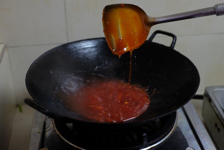 - Step 10 COOK SAUCE: Add spring onions and cook until its lightly burned. Add sauce, turn to high heat, and bring to a boil (15 seconds). Add half of the thickening and keep stirring until sauce becomes thick yet fluid. Add more if need be. Off the heat and let the sauce cool a little (15 seconds)