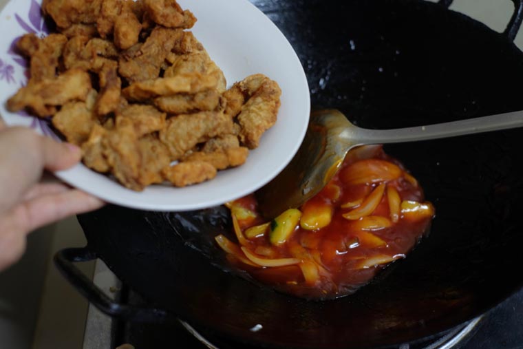 - Step 11 ADD PORK & VEG INTO THE SAUCE: Add meat and vegetables into the sauce. Stir a few time to coat. Dish out and serve hot.