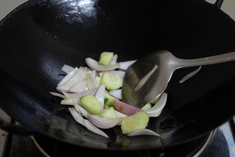 - Step 2 PREP: Peel and chop cucumber into bite-sized pieces. Slice onions into wedges. Slice white part of spring onions into 2 cm sections.