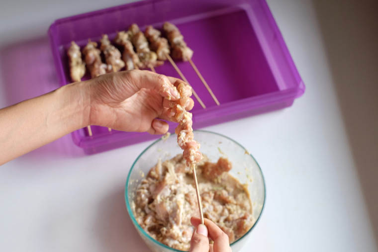 - Step 5 THREAD CHICKEN ON SKEWERS:Poke marinated chicken through bamboo skewers.