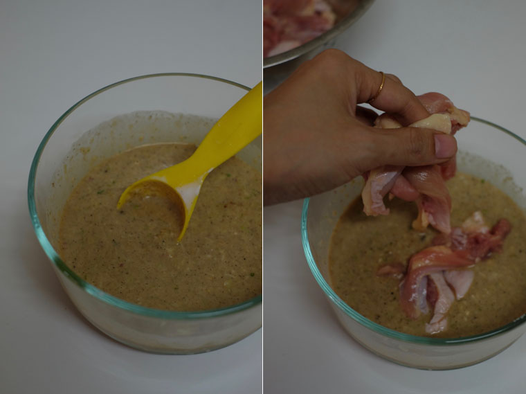 - Step 3 MAKE MARINADE: Pour the paste, pepper powder, salt, sugar, oyster, soy sauce, corn flour, coconut milk, egg white and cooking oil into a container.