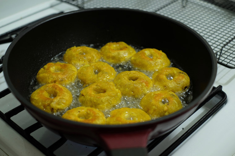 - Add doughnuts into sugar syrup only when the sugar syrup is thick enough. Do not do so when the syrup is still watery.