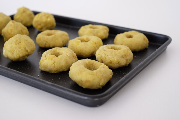 - Step 4 SHAPE INTO DOUGHNUTS: Coat your hands and work surface with flour to prevent sweet potato from sticking to your hands. Scoop sweet potatoes into your hands and roll into equal size balls (50 g is not too big and not too small). Then shape them into doughnuts.