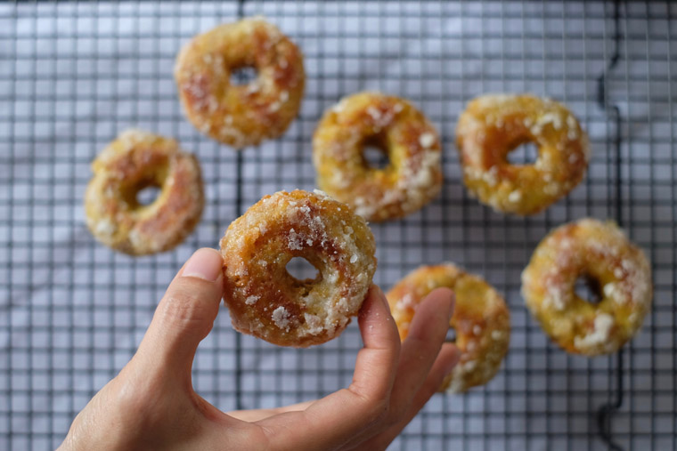 My favourite part of making this dessert is glazing the crispy doughnuts with sugar. It’s almost magical to see sugar syrup turn into beautiful snow-like flakes which stick onto the doughnuts!