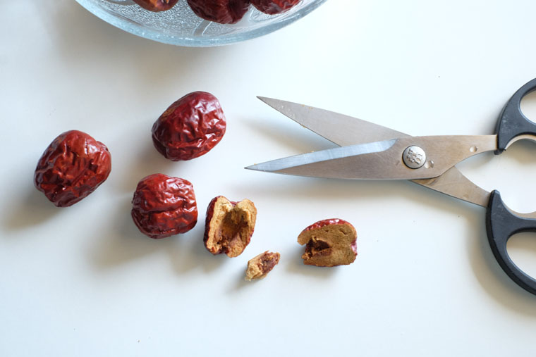 1. Slice red dates To extract maximum flavour, cut the dates into half. I like to use a pair of sharp scissors to do so ( it’s much easier!)