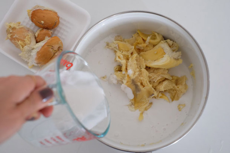- Step 1 TO COOK MIXTURE: Remove flesh from durian. Add durian flesh, coconut cream, milk and sugar into the pot. Cook mixture in low fire and stir it with a whisk until its mixed well.