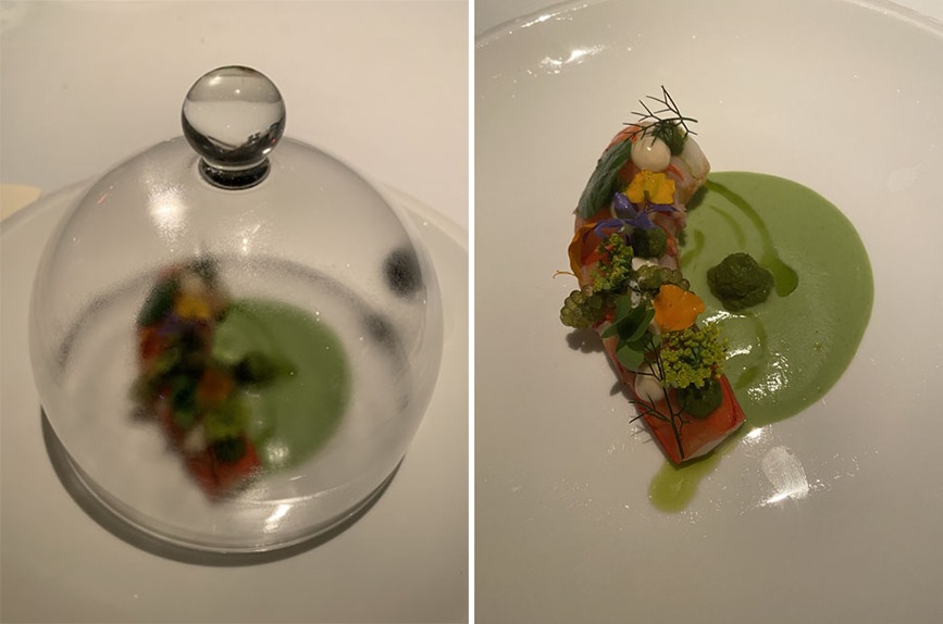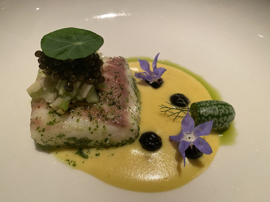 What is it? Curry leaf marinated sea bream, lemon chili comte, brined mango & fennel salad, osettra caviar, and black garlic.