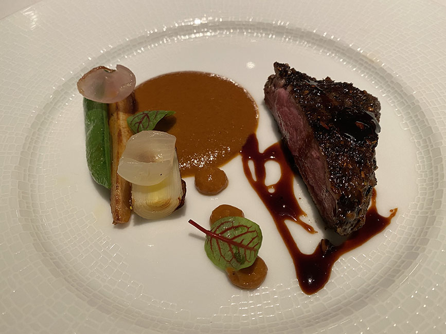 What is it? Lamb loin with mutton curry, lamb jus, onion, and sous vide burdock and beans.