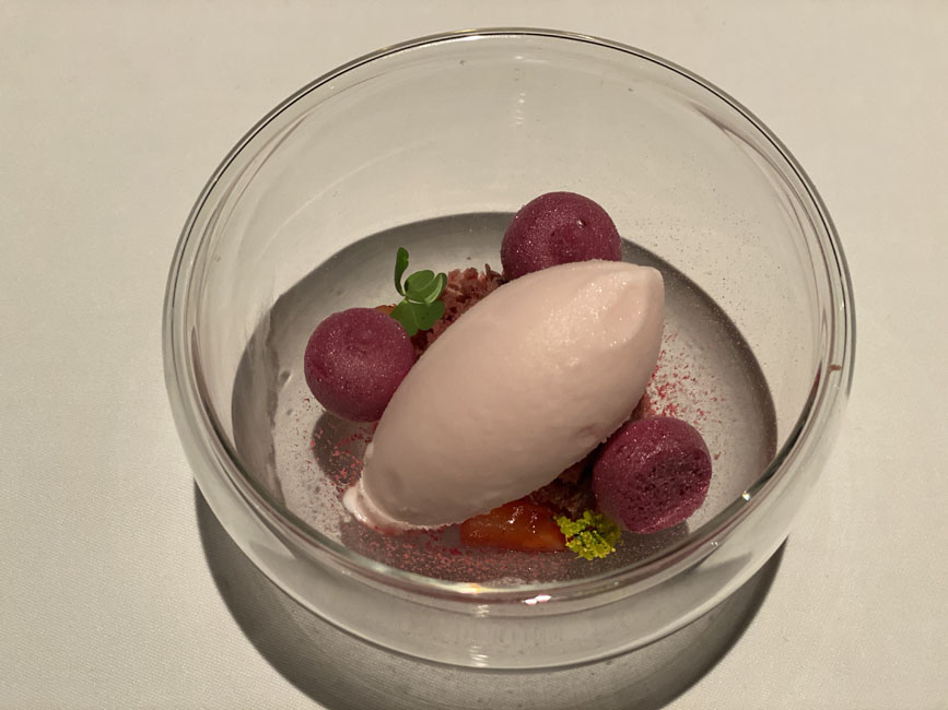 What is it? Sorbet made from torch ginger flower (bunga kantan) and served with compressed strawberry and beetroot meringue. It’s finished with micro plants – wood sorrel and fennel flower.
