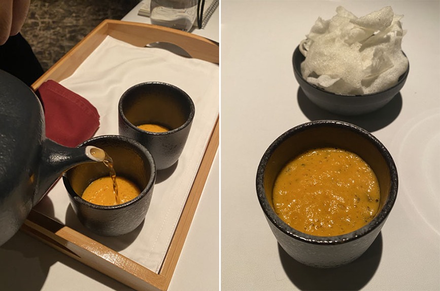 What is it? Rasam soup infused with tomato. This humble broth is not so humble; 20 kilos of tomatoes are steamed to produce 4 kilos of tomato paste to be strained into the spiced soup. Commonly eaten with rice, the chef chose to serve it with paper-thin rice crackers instead.